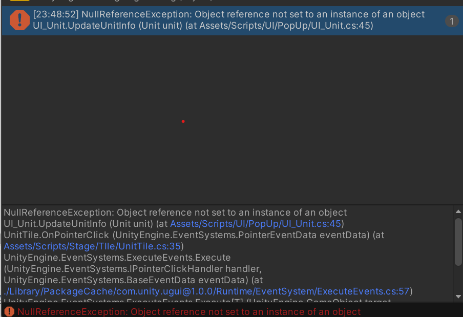 오류 메시지를 통해 UI_Unit.UpdateUnitInfo 메서드에서 NullReferenceException이 발생한 것을 확인할 수 있었습니다. 이는 UI_Unit 클래스의 UI 요소가 아직 초기화되지 않은 상태에서 UpdateUnitInfo 메서드가 호출되었기 때문입니다. 구체적으로, Init() 메서드가 Start()에서 호출되면서 UI 요소의 바인딩이 늦어져서 발생한 문제였습니다.